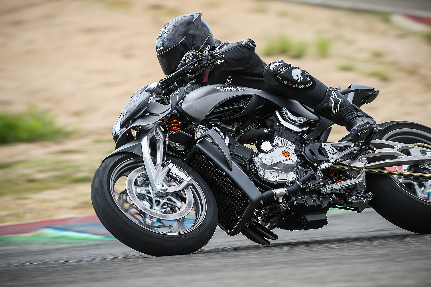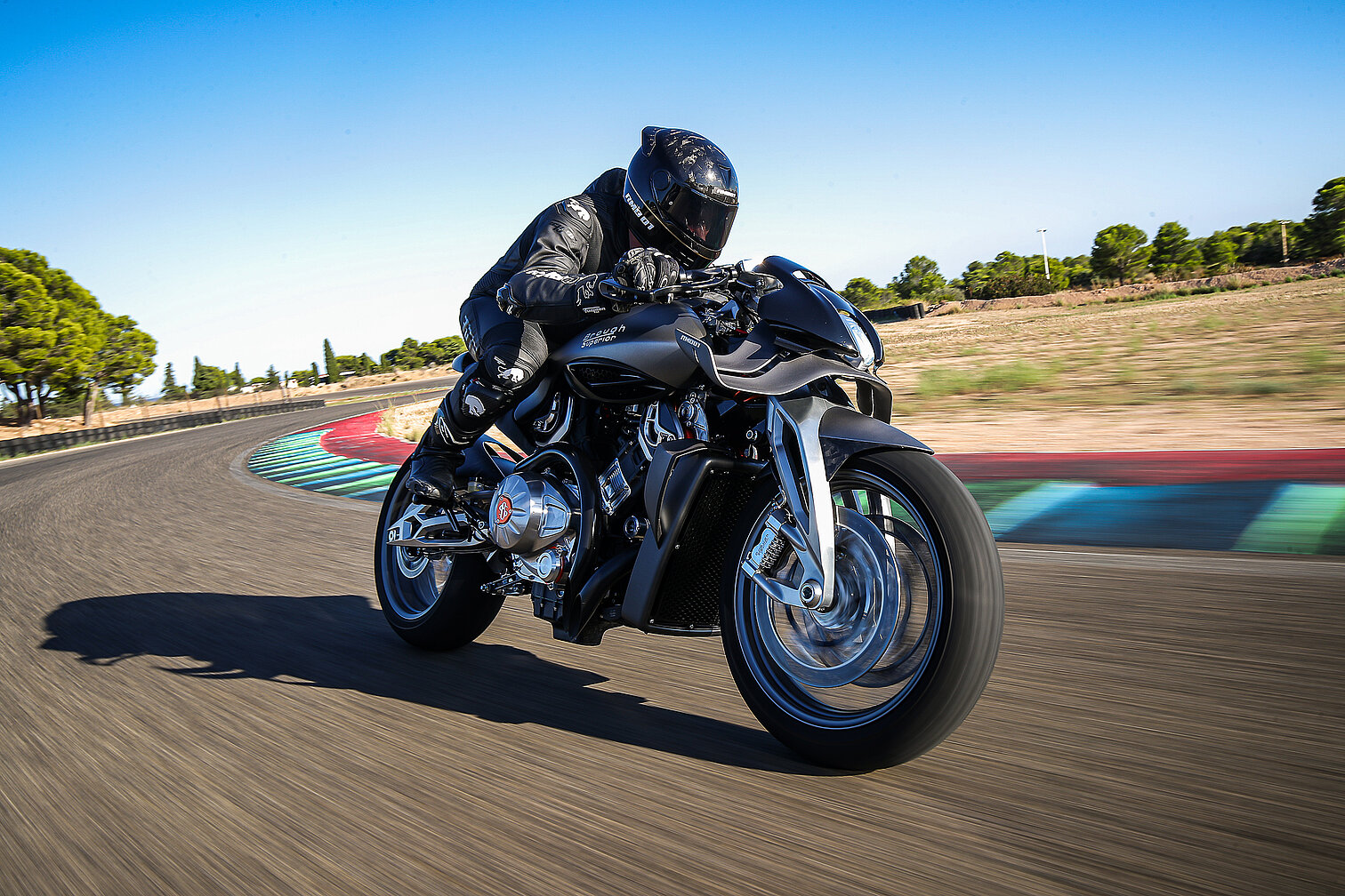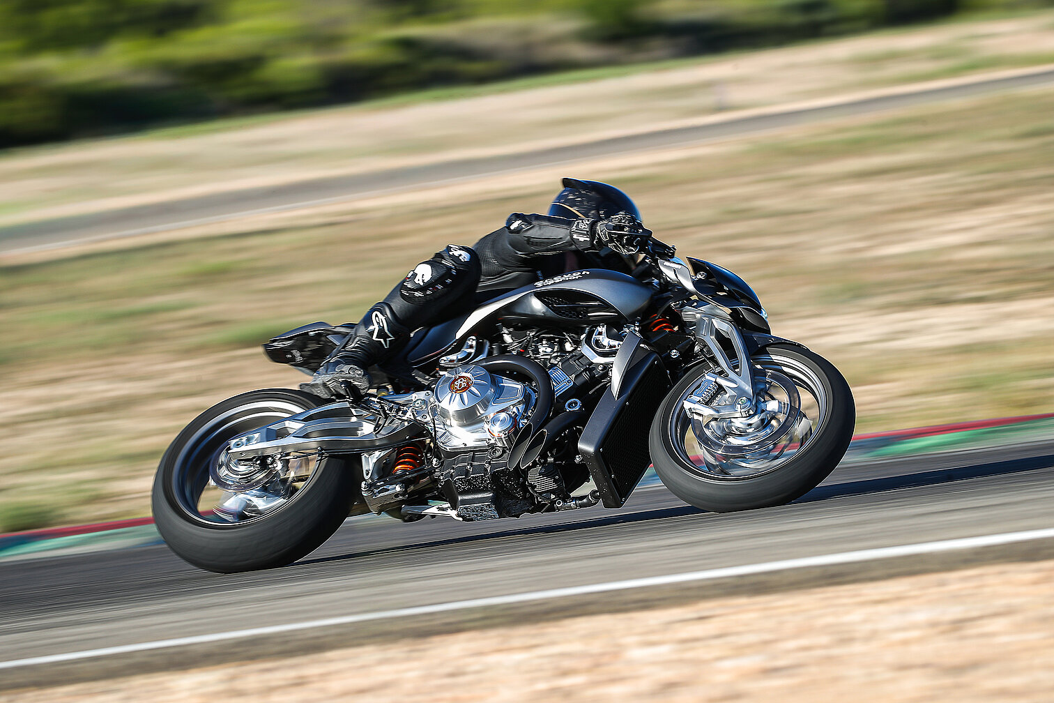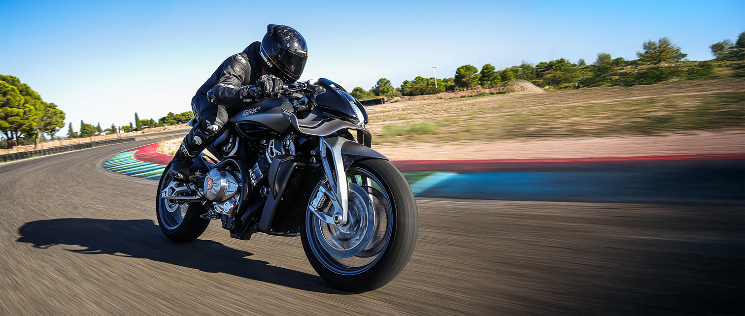 Un cadre en carbone forgé, un exosquelette autoportant, combiné à un moteur structurel entièrement usiné à partir de blocs massifs d'alliage de qualité aéronautique. Il en va de même pour le train roulant (bras oscillant et fourche). Cette conception limite le poids, gage d'efficacité.