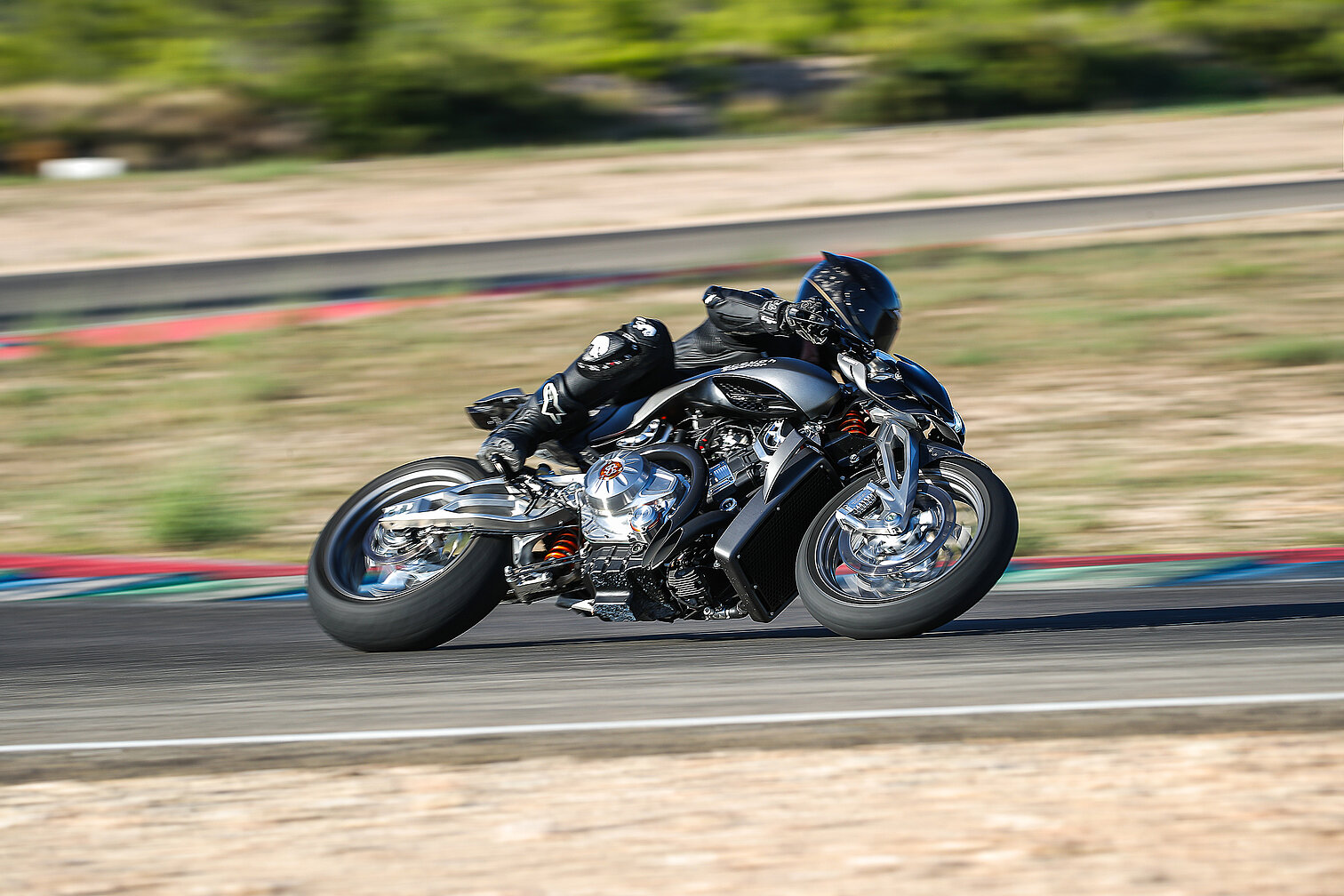 Le sculptural bicylindre de 997 cm3, fabriqué à partir de blocs massifs d'aluminium de haute qualité (alliage de la série 5000, à forte teneur en magnésium), est doté de carters entièrement usinés par une machine à commande numérique à 5 axes.